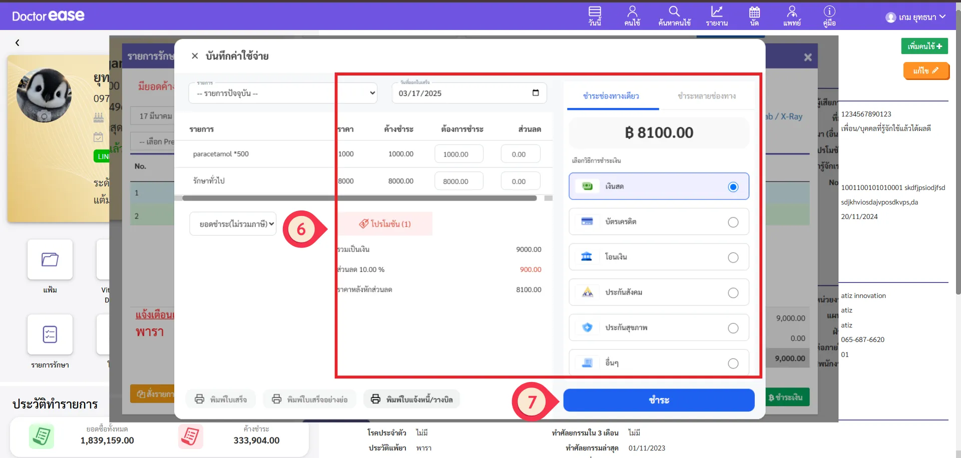 ฟีเจอร์ “ชำระเงิน” ออกแบบมาเพื่อช่วยให้คลินิกสามารถ ขายสินค้า/ยา, บริการหัตถการ, คอร์ส และบริหารค่าใช้จ่ายของแพทย์และห้องปฏิบัติการภายนอก ได้อย่างเป็นระบบ รองรับการกำหนดค่า DF/ค่ามือ ทั้งแบบเปอร์เซ็นต์หรือแบบฟิกเรทเป็นจำนวนเงินคงที่