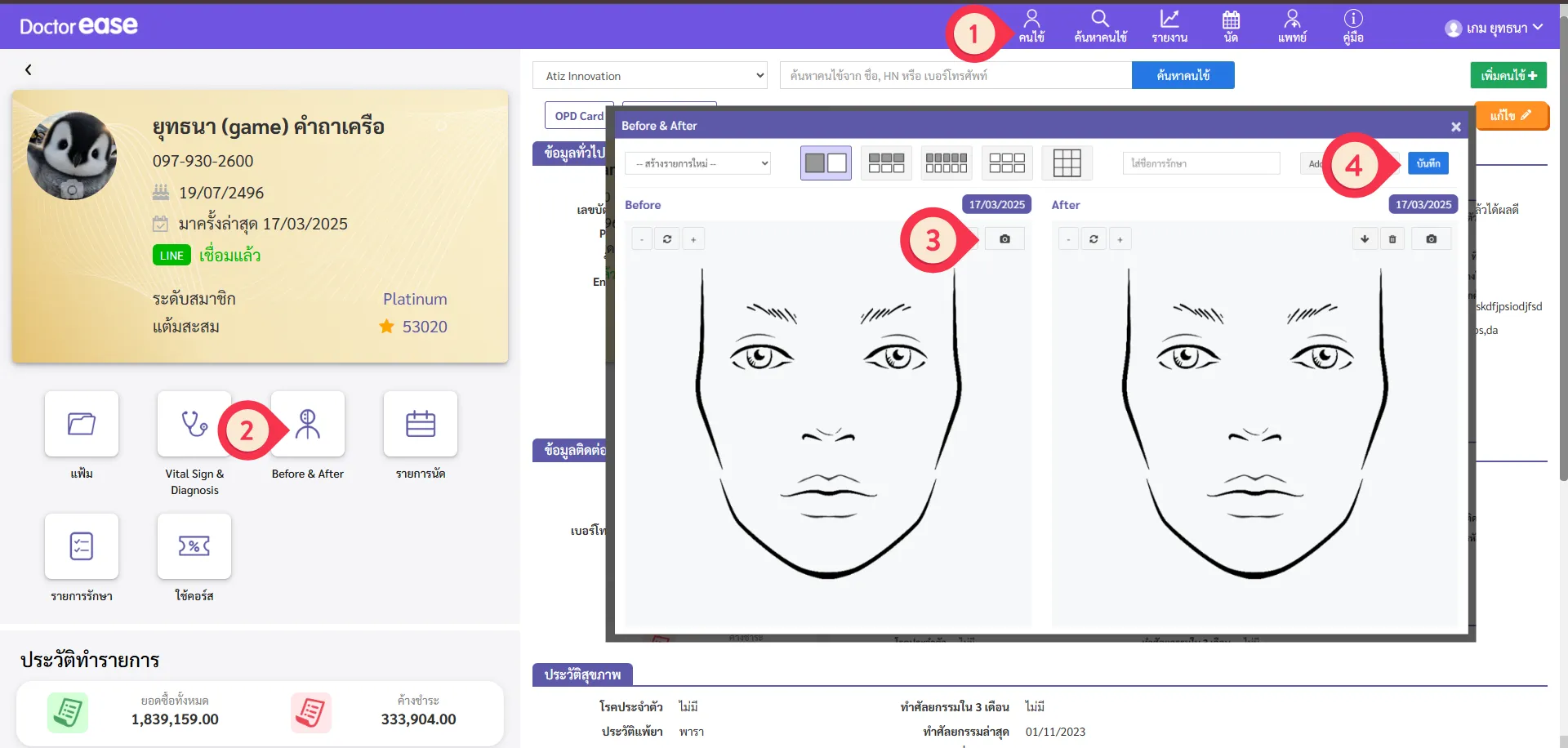 ฟีเจอร์ “Before & After” ออกแบบมาเพื่อให้คลินิกสามารถ บันทึกและเปรียบเทียบภาพก่อน-หลังการทำหัตถการ ได้อย่างเป็นระบบ รองรับการจัดเก็บภาพใน 3 รูปแบบ ได้แก่ 1:1, 3:3, และ 5:5 โดยสามารถบันทึกวันที่ถ่ายรูป และเรียกดูย้อนหลังได้ตั้งแต่ครั้งแรกที่นำเข้าภาพ