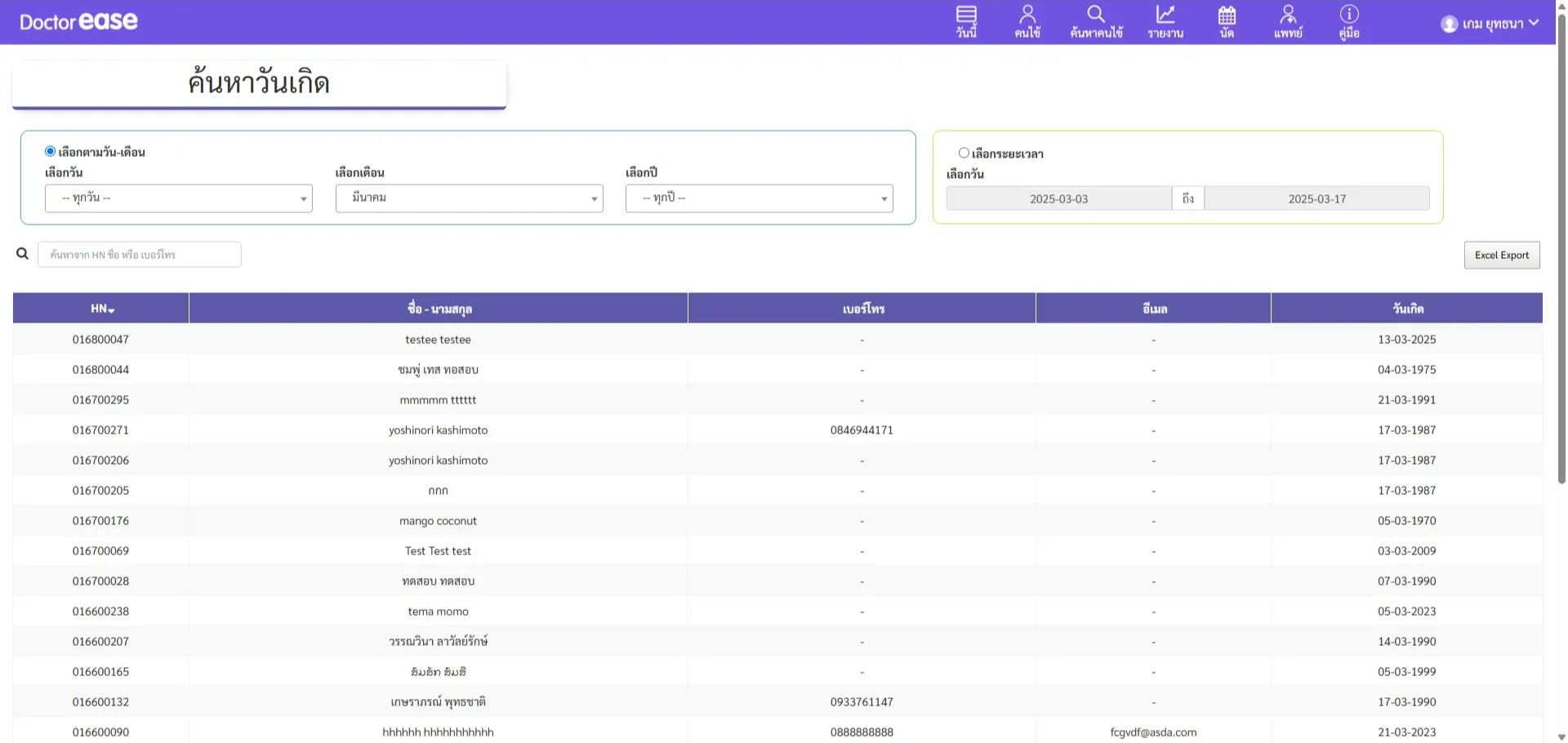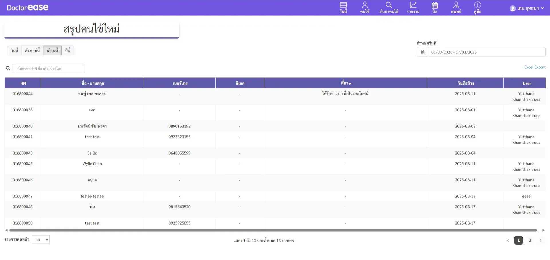 คนไข้ใหม่ → ดูจำนวนคนไข้ใหม่ที่เพิ่มเข้ามาในแต่ละช่วงวันที่เลือก