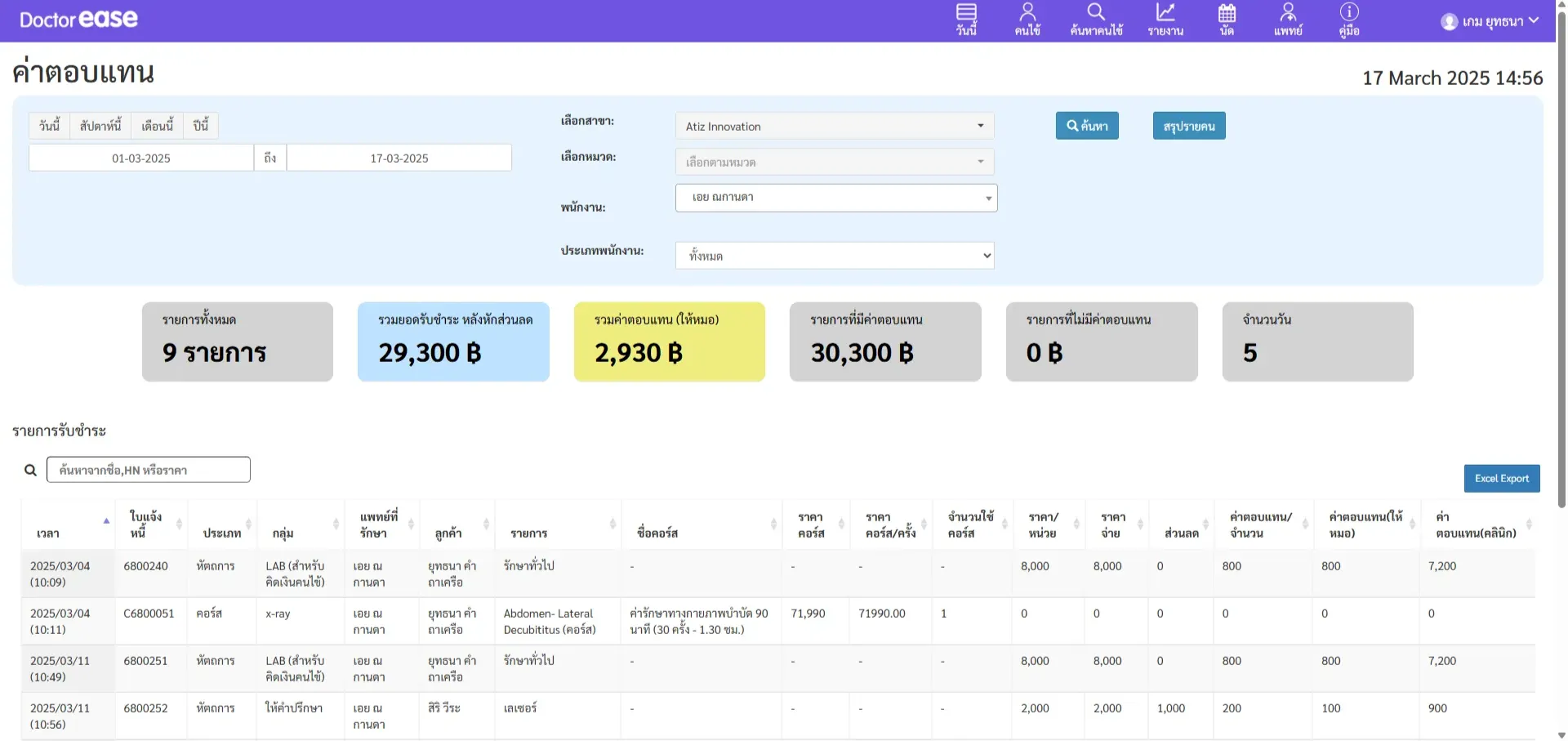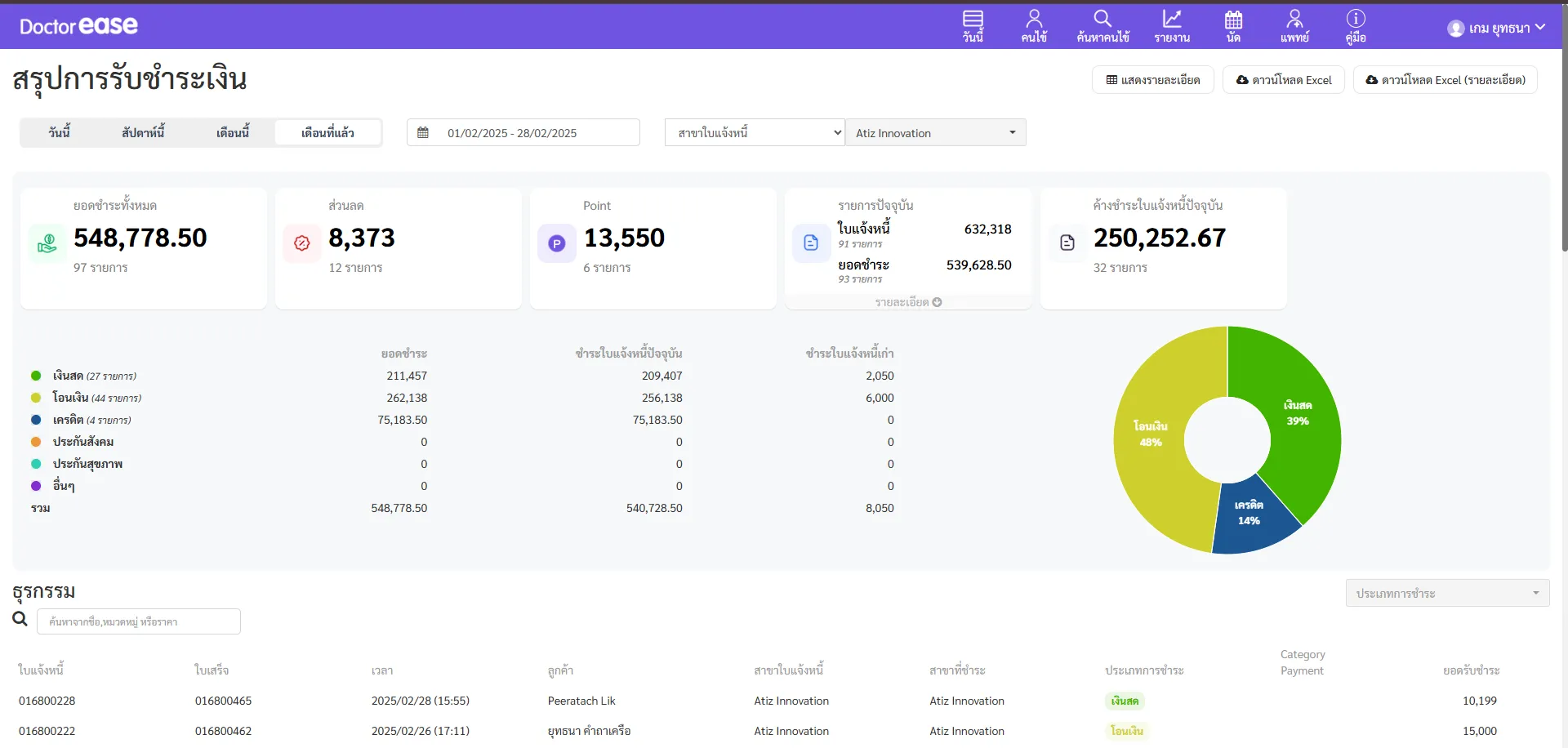 สรุปการรับชำระเงิน → ดูรายละเอียดการเงินของคลินิก
