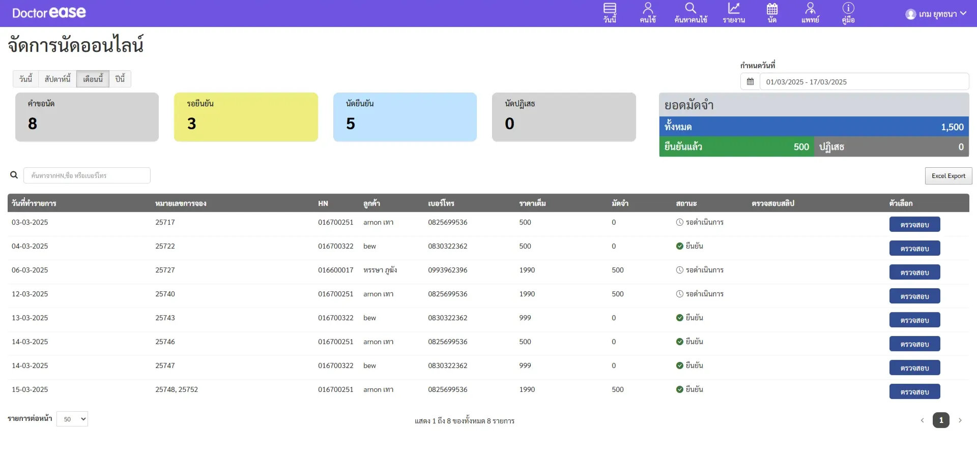 นัดออนไลน์ → ดู รายชื่อลูกค้าที่จองผ่านลิงก์ Booking Online และ ยืนยัน/ยกเลิกนัด