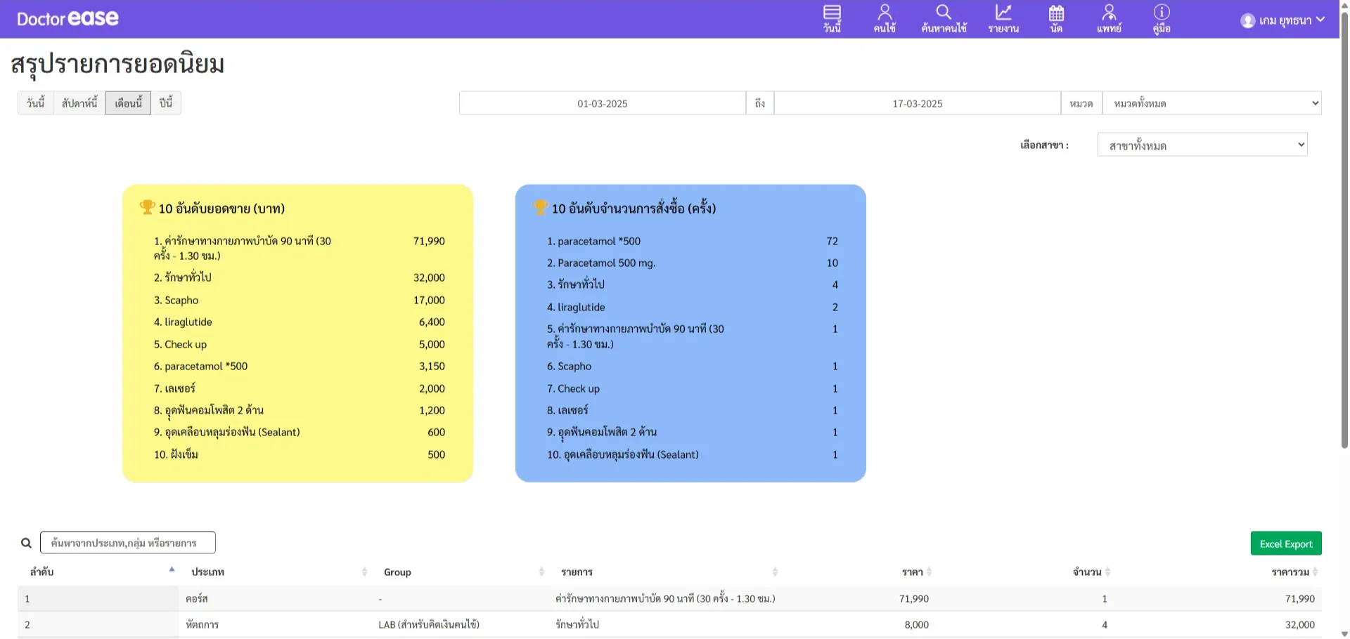 รายการยอดนิยม → ดูรายการขายดี (เวชภัณฑ์, หัตถการ, คอร์ส)