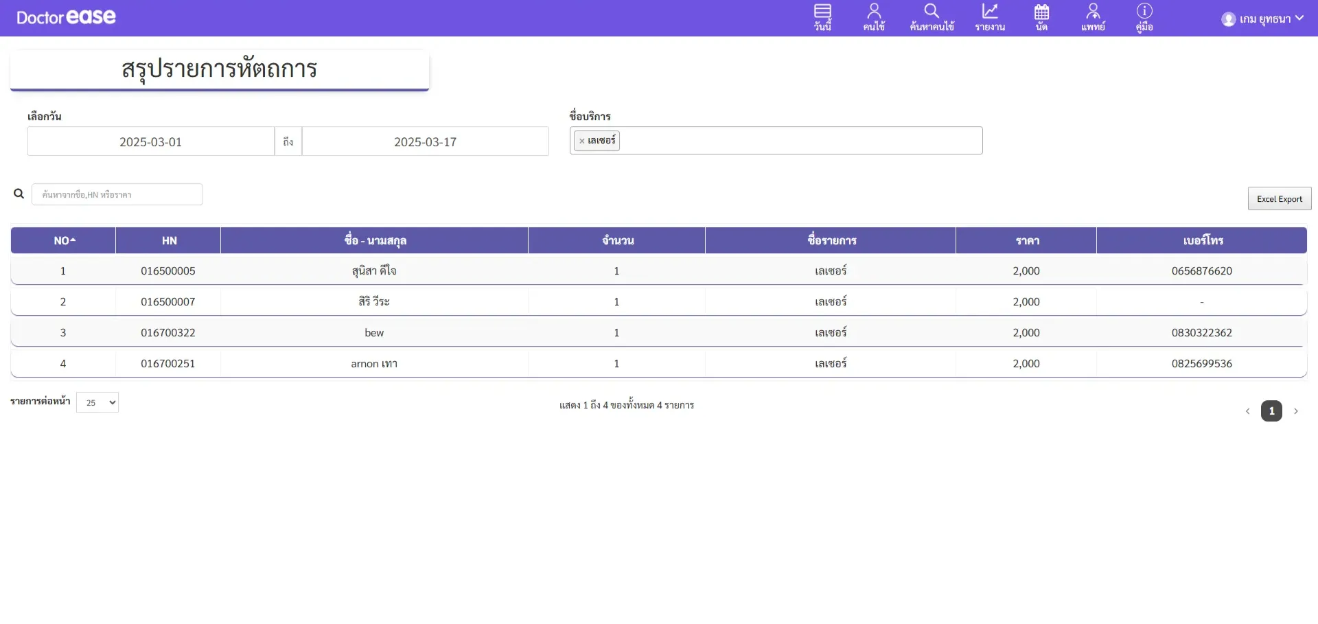 รายการหัตถการ → ค้นหา รายการหัตถการเฉพาะ เช่น เลเซอร์ พร้อมรายชื่อคนไข้