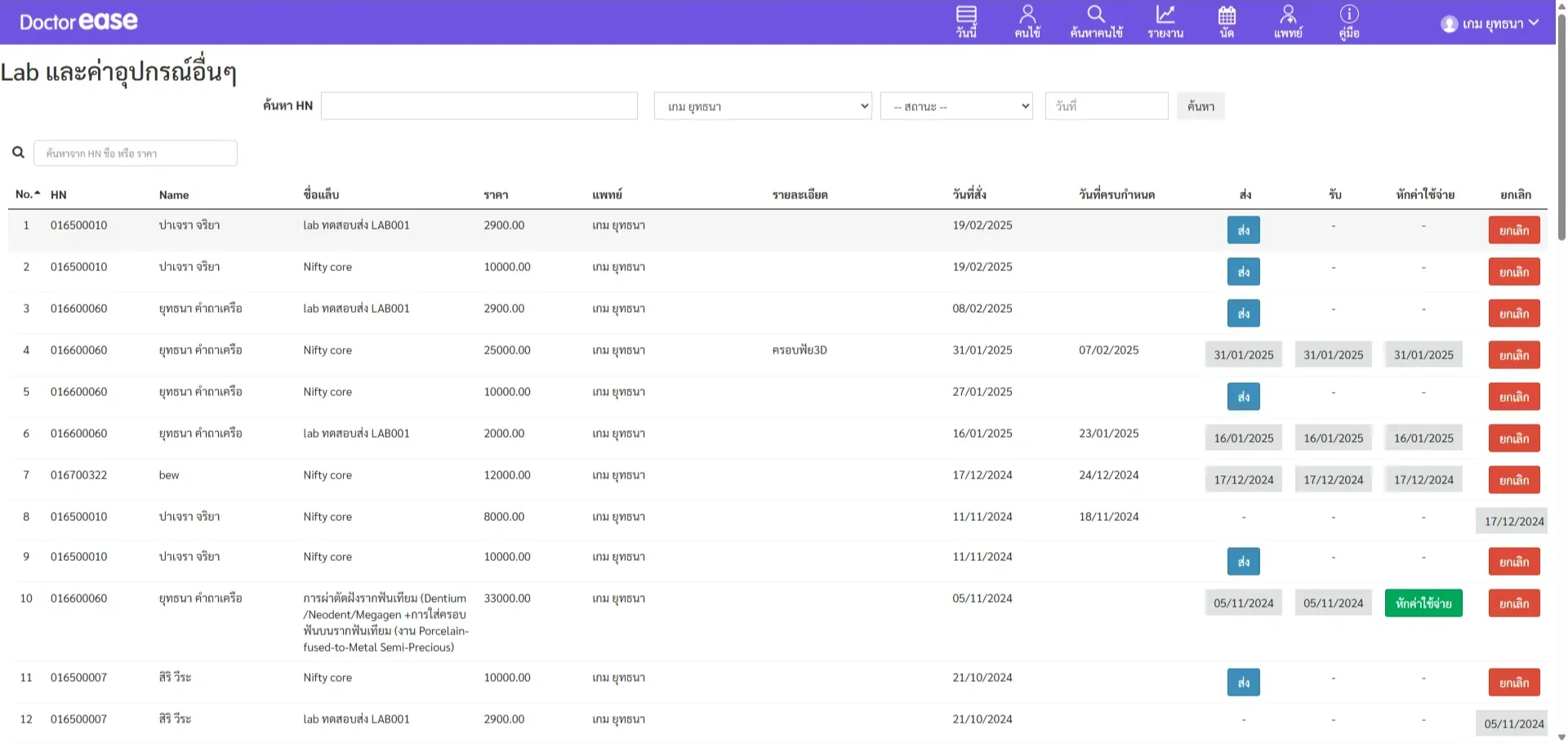 Lab ภายนอก → ดูข้อมูลการส่ง Lab ไปบริษัทภายนอก และ การหักค่าใช้จ่ายกับแพทย์