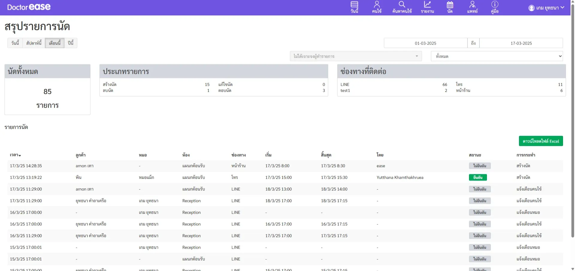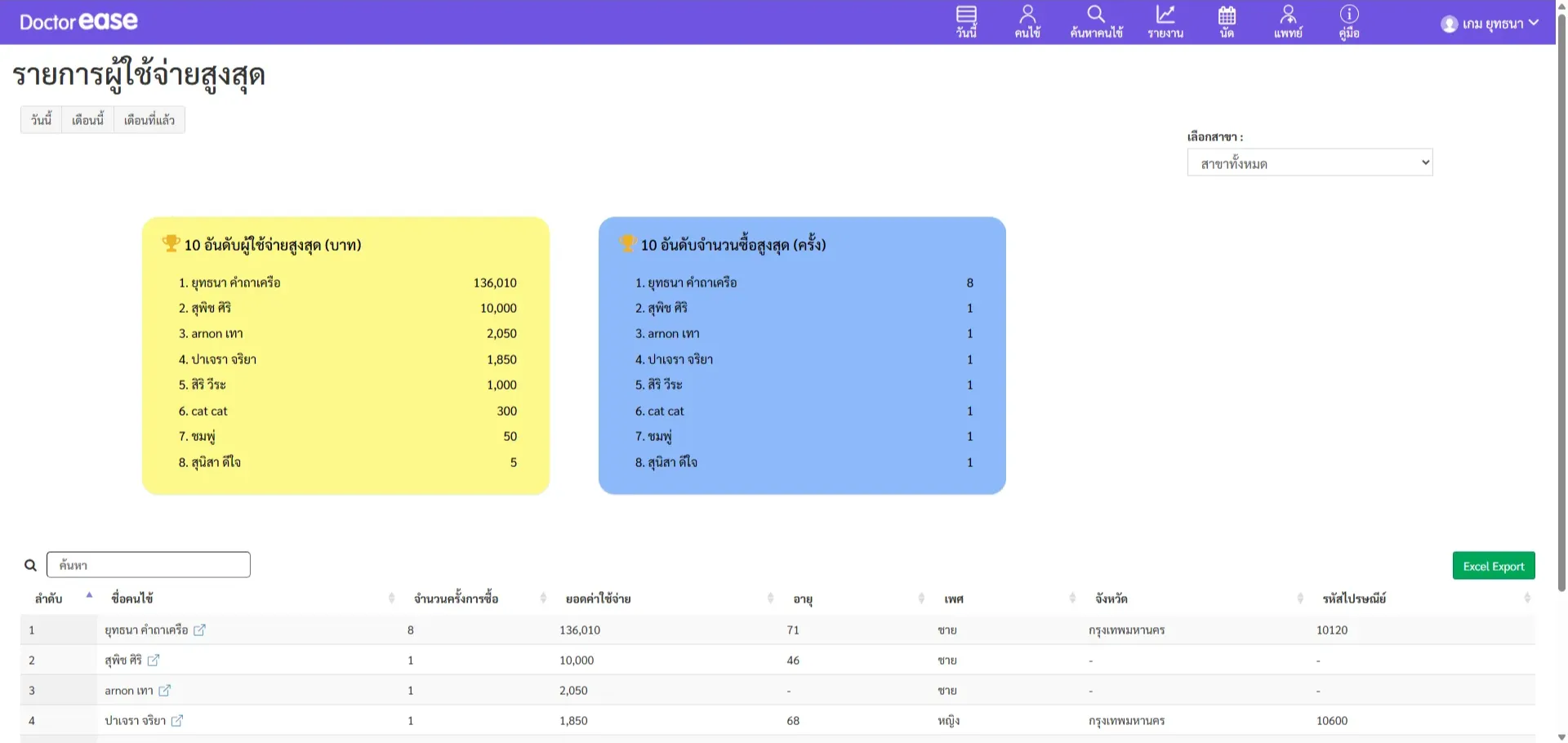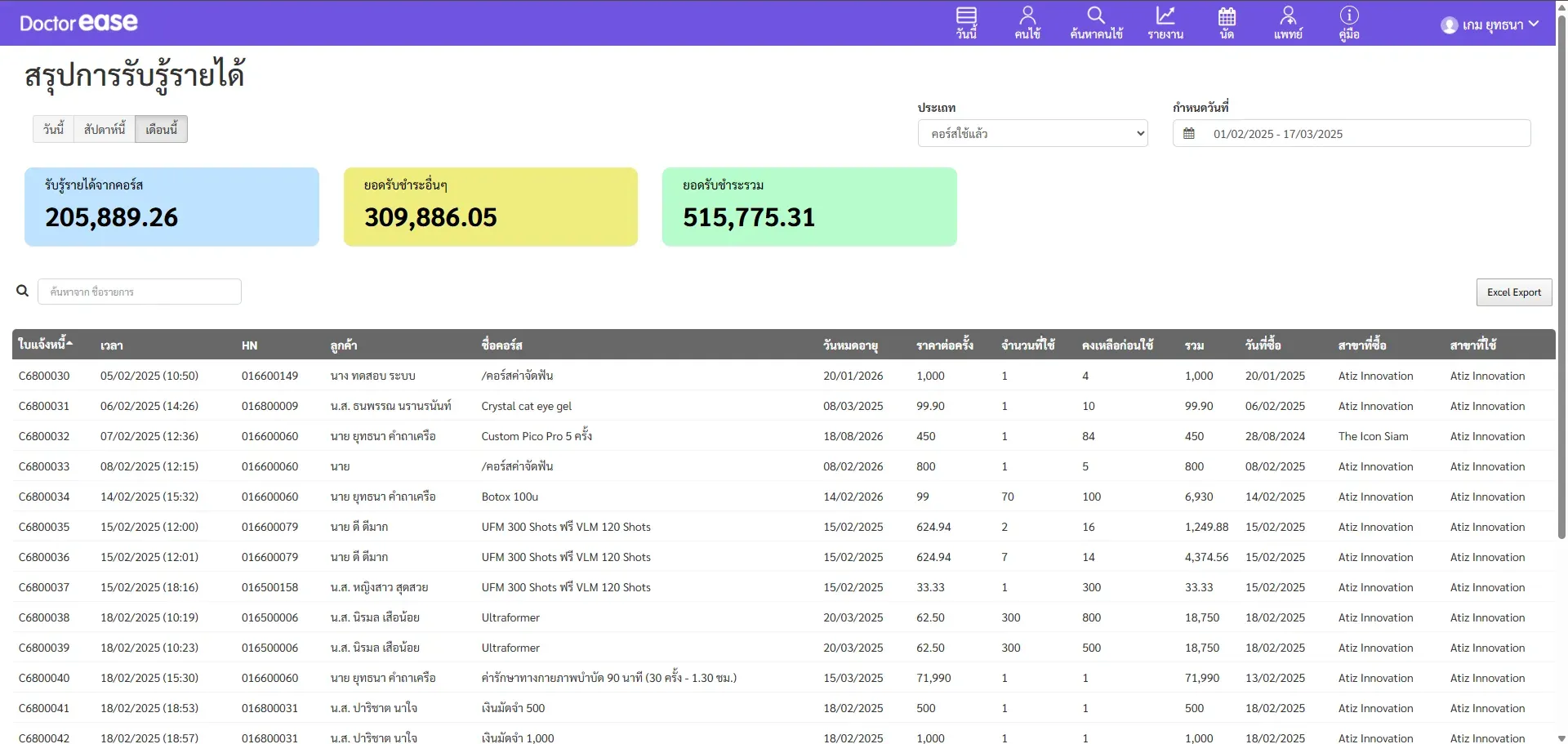 ฟีเจอร์ “รายงาน” ออกแบบมาเพื่อช่วยให้คลินิกสามารถ ติดตามข้อมูล วิเคราะห์แนวโน้ม และบริหารจัดการธุรกิจได้อย่างเป็นระบบ โดยมี กราฟสรุปข้อมูล และ รองรับการส่งออก (Export) เป็นไฟล์ Excel เพื่อการวิเคราะห์เพิ่มเติม