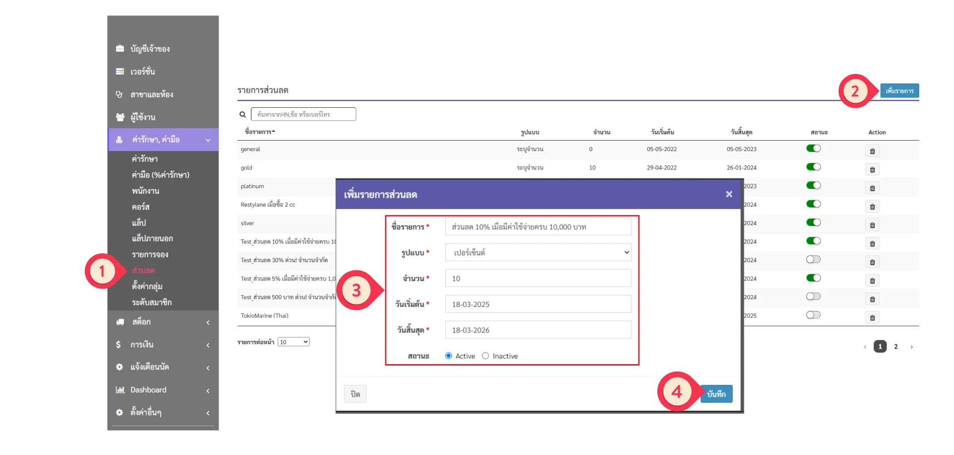 - ไปที่ → การตั้งค่า > ค่ารักษา, ค่ามือ > ส่วนลด > เพิ่มรายการ