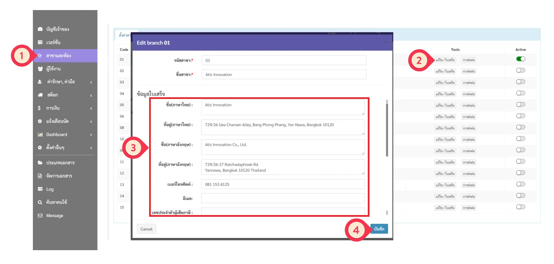- ไปที่ → การตั้งค่า > สาขาและห้อง > แก้ไข/ใบเสร็จ