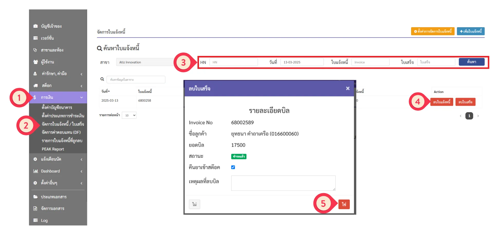 วิธีลบใบแจ้งหนี้/ใบเสร็จใน DoctorEase