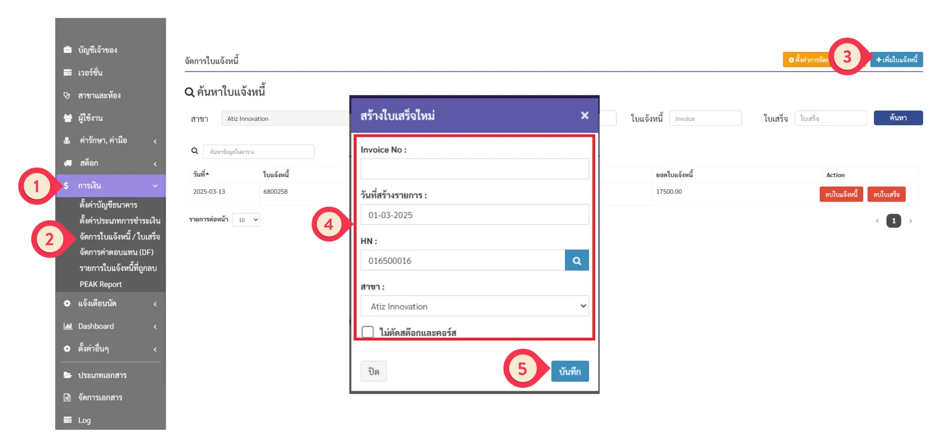 • ระบบจะรันเลข Invoice อัตโนมัติ (ไม่ต้องกรอกเอง)