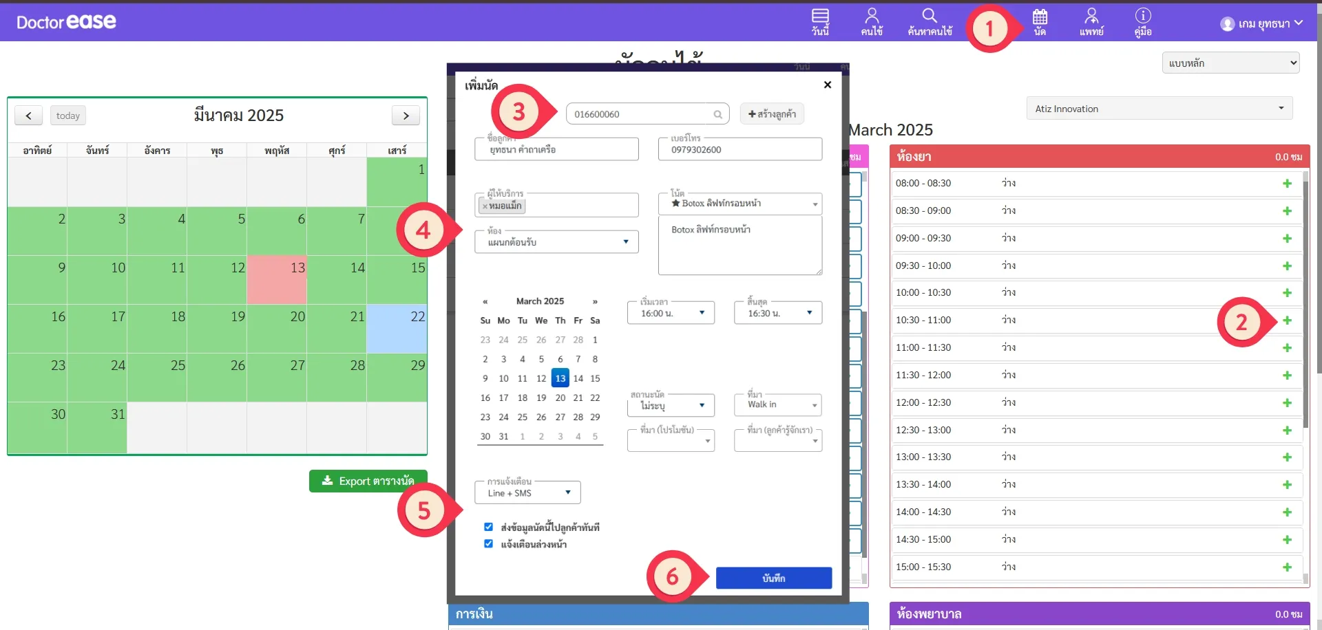 • กำหนดรายละเอียดนัดหมาย เช่น ผู้ให้บริการ, ห้อง, เวลา และบันทึกโน้ตเพิ่มเติม