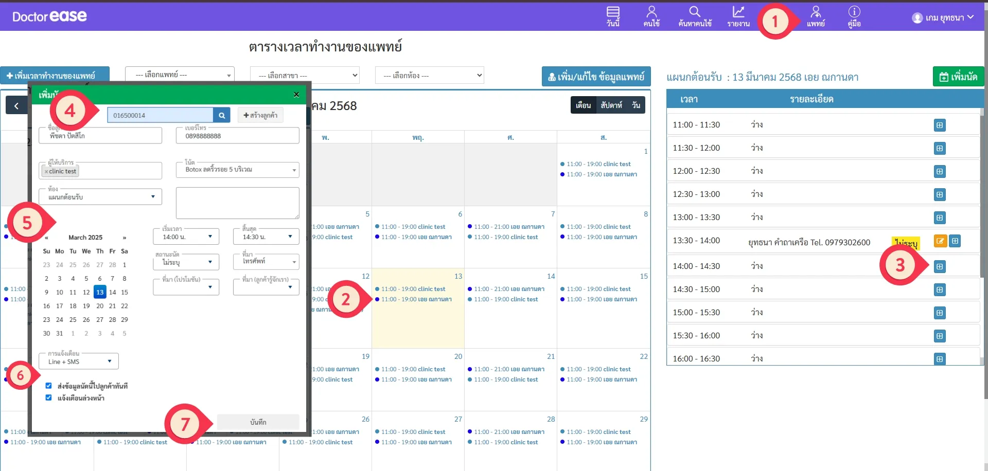 DoctorEase ช่วยให้คลินิกสามารถลงนัดหมายลูกค้าได้สะดวกและเป็นระบบ รองรับการทำนัด 3 รูปแบบ ได้แก่ นัดหมายลูกค้า Walk-in, นัดหมายล่วงหน้า และ นัดหมายกับแพทย์โดยตรง